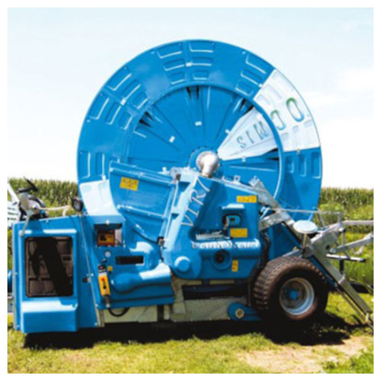 Irigatoare cu motopompa montata pe cadrul masinii pentru aspiratie directa din canal, sau ca pompa de amplificare.